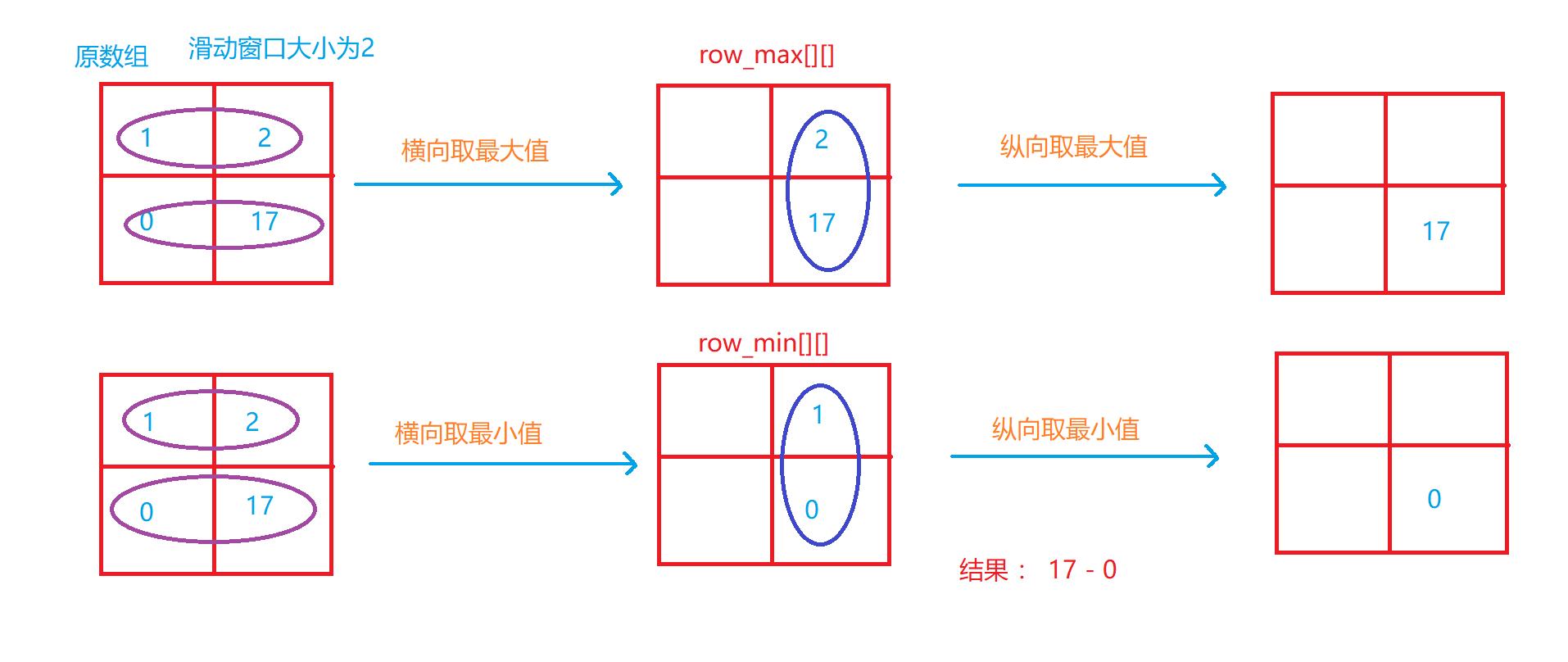 输出仅一个整数,为 矩阵中所有 正方形区域中的最大整数和最小整数的差值」的最小值。